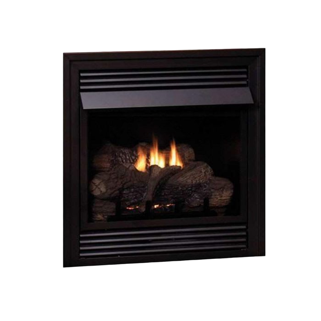 This medium size vent-free fireplace system will fit in almost any room. Comes complete with firebox, burner, and gas logs. This unit also includes flat black slat louvers, flat black outer frame trim kit and black hood. Also available in hammered pewter finish.